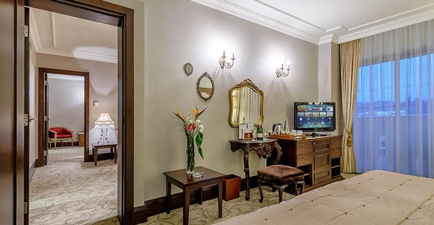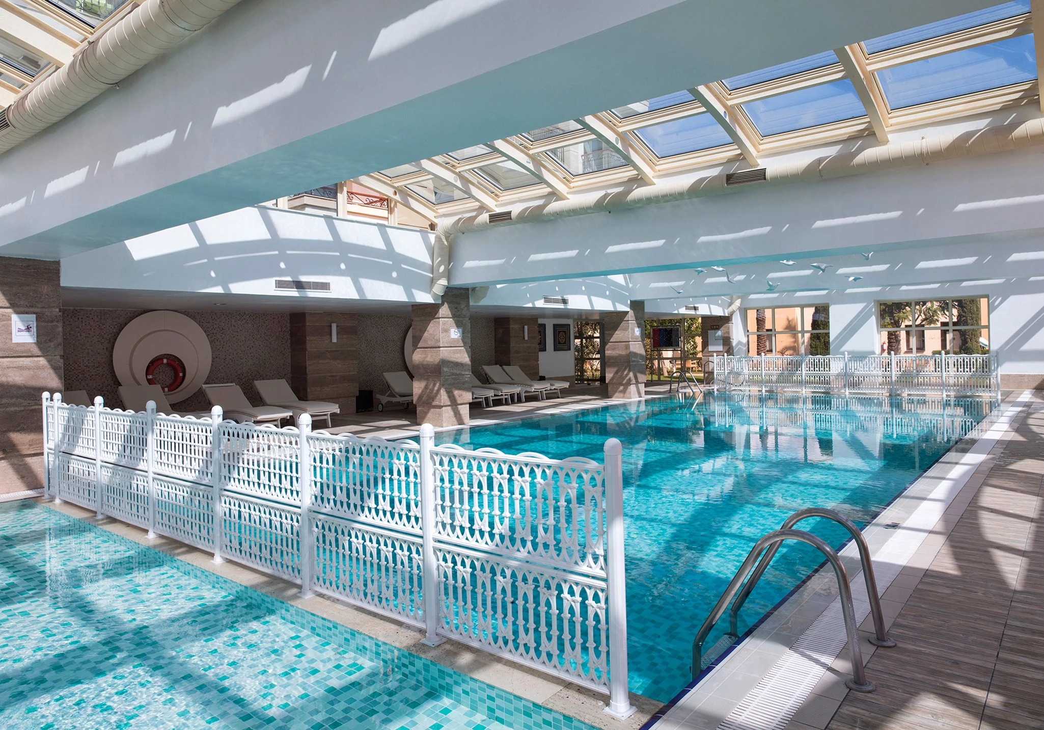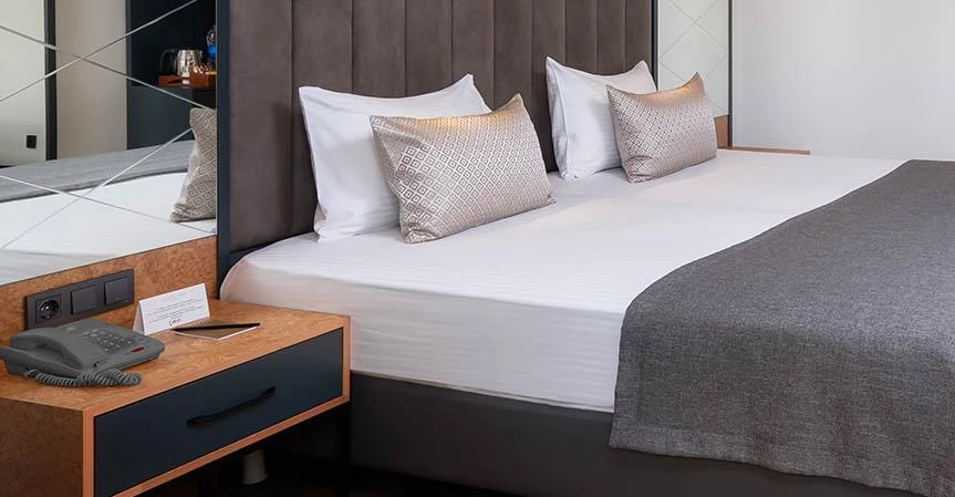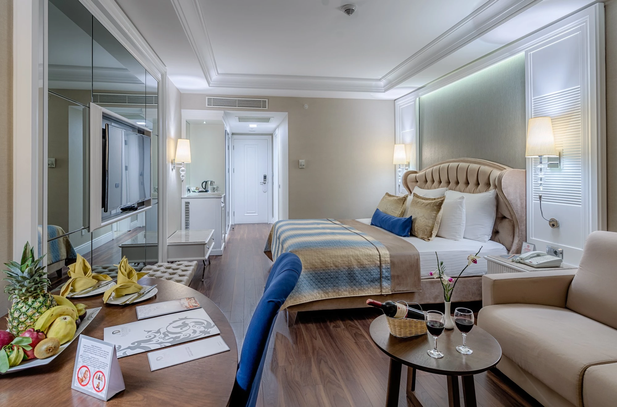 Deluxe rooms of the facility do not have twin beds, only French beds. The Deluxe Block within the facility is separate from the main building and is a block built in 2013 and equipped with the latest technology. The connection of the Deluxe Blok with the main building is provided by an overpass. Deluxe Block section has its own indoor and outdoor pool, children's pool and pool bar. Guests staying in the deluxe building and the main building can benefit from the services of both blocks.