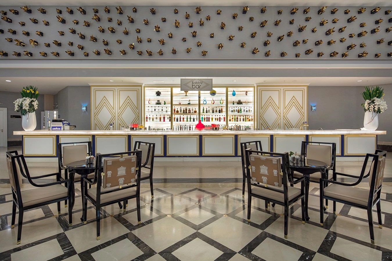 Lobby Bar 09.00-00.00, Black Sport's Bar 10.00-18.00, Perla VIP Lounge Bar 16.00-07.00 and Terrace Bar 10.00-23.30, Vena Vitamin Bar, Indoor Pool Bar, Pool Bar, Turquoise Bar, Beach Bar 10.00-18.00, Dionysos Wine Corner 18.30-21.00, Long Bar 10.00-18.00 and Oriental tea-coffee corner 16.00-07.00.