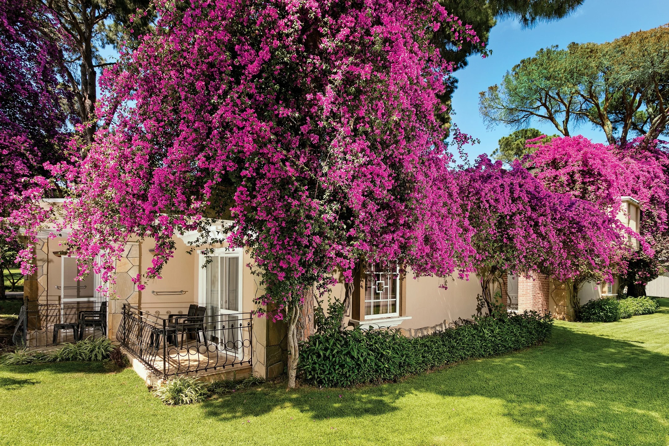 Enjoy the unique view of Pine Beach on the sparkling Mediterranean coast surrounded by lush trees and colorful flowers.