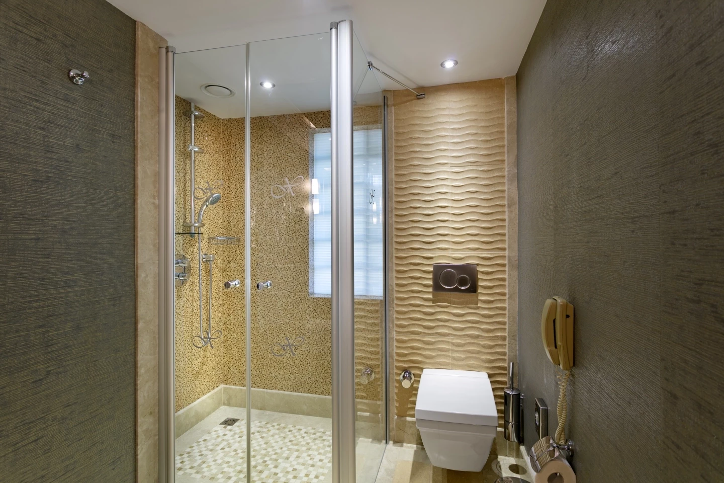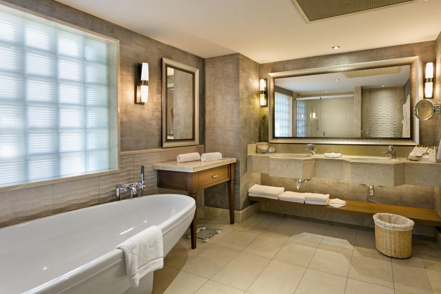 An additional set of bathroom accessories (bathrobes, slippers, hardware) in the room,
